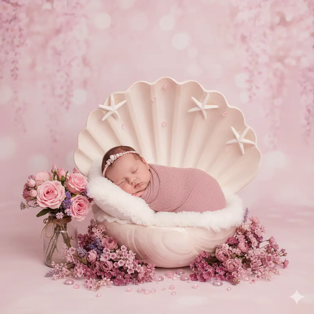 Prompt Baby AI Photo Prompt 10:- A dreamy, fairytale-like photograph of a newborn baby sleeping soundly in a large, prop seashell, evoking a “Little Mermaid” or oceanic princess theme.