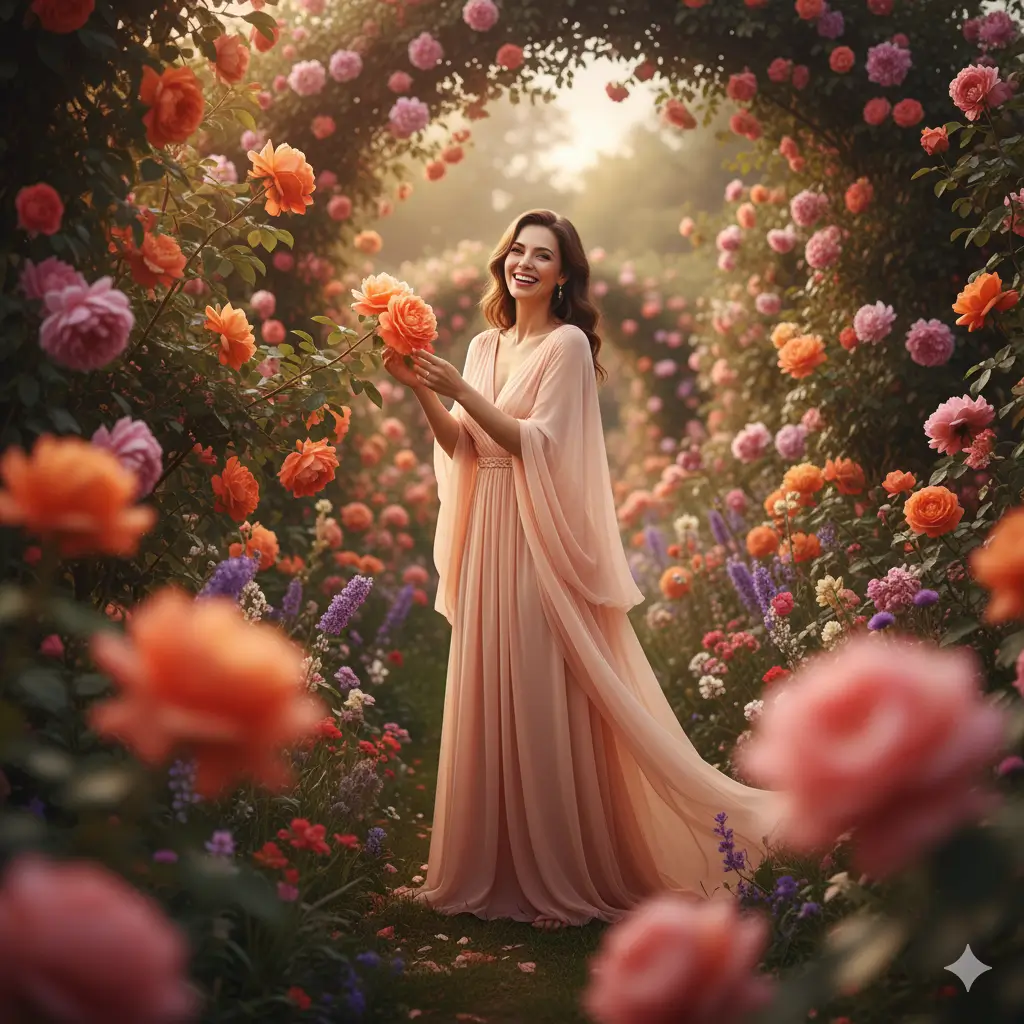 “woman in peach gown standing in soft evening light, smiley expression, blurred flower garden background, ultra-realistic cinematic portrait”A garden decorated with vibrant climbing flowers. The garden has blooming clus-ters of orange, pink, and purple flowers flowing along it, with some blurred in the foreground for a dreamy depth-of-field effect. The person is smiling joyfully, looking at and gently touching the flowers, radiating happiness and natural charm.