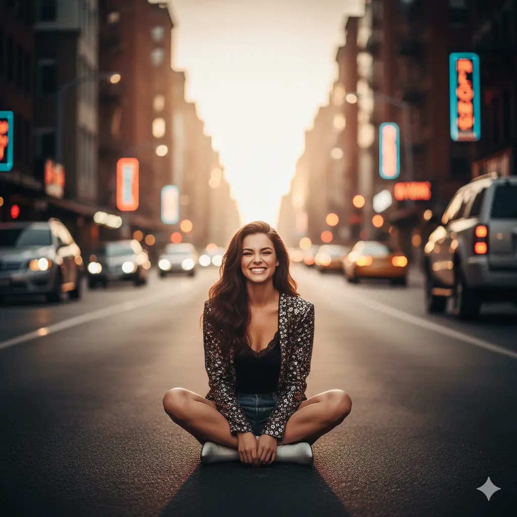 “women in denim shorts and fancy tshirt sitting in soft evening light, funny expression, blurred city background, ultra-realistic cinematic portrait”A warm, golden-hour outdoor portrait of a person standing next to a rustic stone wall decorated with vibrant climbing flowers. The wall has blooming clus-ters of orange, pink, and purple flowers flowing along it, with some blurred in the foreground for a dreamy depth-of-field effect. The person is smiling joyfully, looking at and gently touching the flowers, radiating happiness and natural charm.