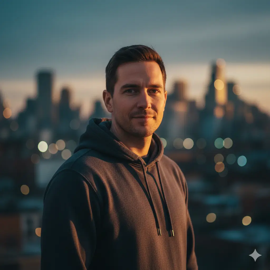 “Man in hoodie standing in soft evening light, confident expression, blurred city background, ultra-realistic cinematic portrait”A warm, golden-hour outdoor portrait of a person standing next to a rustic stone wall decorated with vibrant climbing flowers. The wall has blooming clus-ters of orange, pink, and purple flowers flowing along it, with some blurred in the foreground for a dreamy depth-of-field effect. The person is smiling joyfully, looking at and gently touching the flowers, radiating happiness and natural charm.